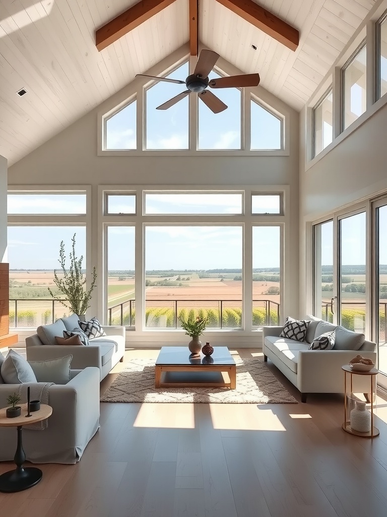 Natural light can completely change the feel of a living space. This modern farmhouse living room showcases large windows that let in plenty of sunlight, creating a warm and inviting atmosphere. The stunning view of the farm outside adds an extra layer of charm to this room.